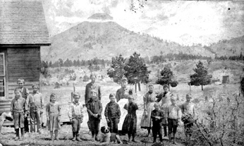 Kids outside the original one room larkspur Schoolhouse Circa 1880s.