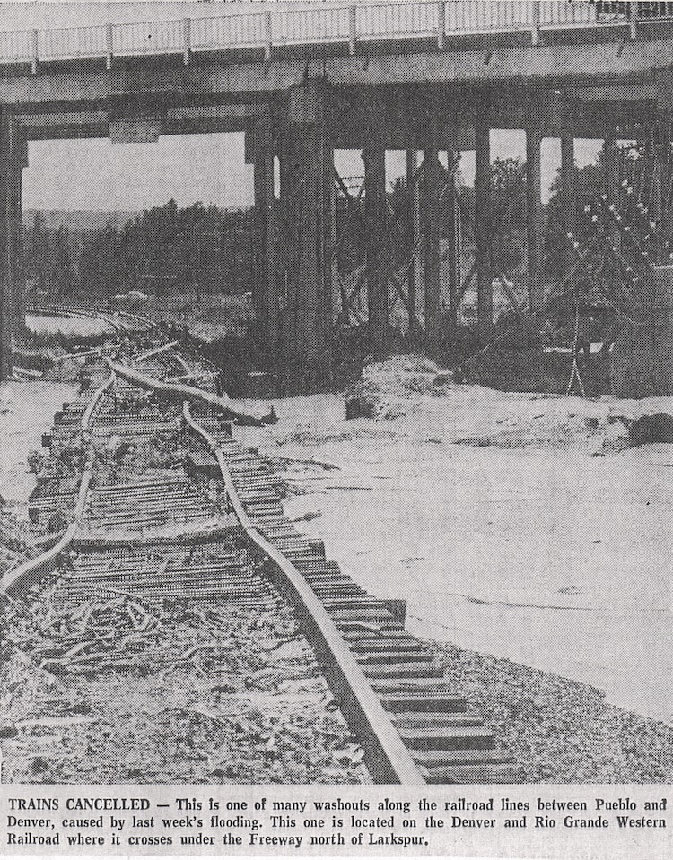 Old Larkspur located down by the Rio Grande RR tracks along Frink Road was severely damaged or totally destroyed. The Frink dairy was 1/3 destroyed, the club house East of Spruce Mountain Road south of town was washed away.