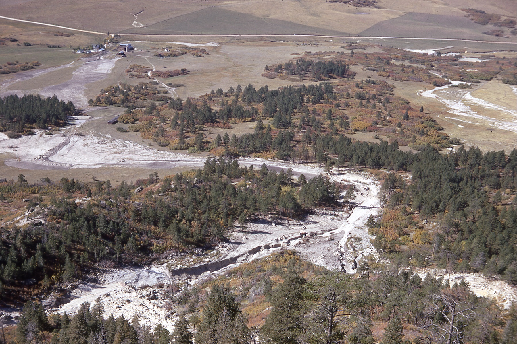 It had been raining for two weeks previous to the big storm so the ground was very saturated. On June 16, 1965 it started raining late morning and 14 inches of rain fell in five hours time. The storm started in Palmer Lake where there was a tornado reported. One can still see the washouts or water spouts as they were called along the hillsides in Greenland, on Dawson Butte, and on Hunt Mountain.