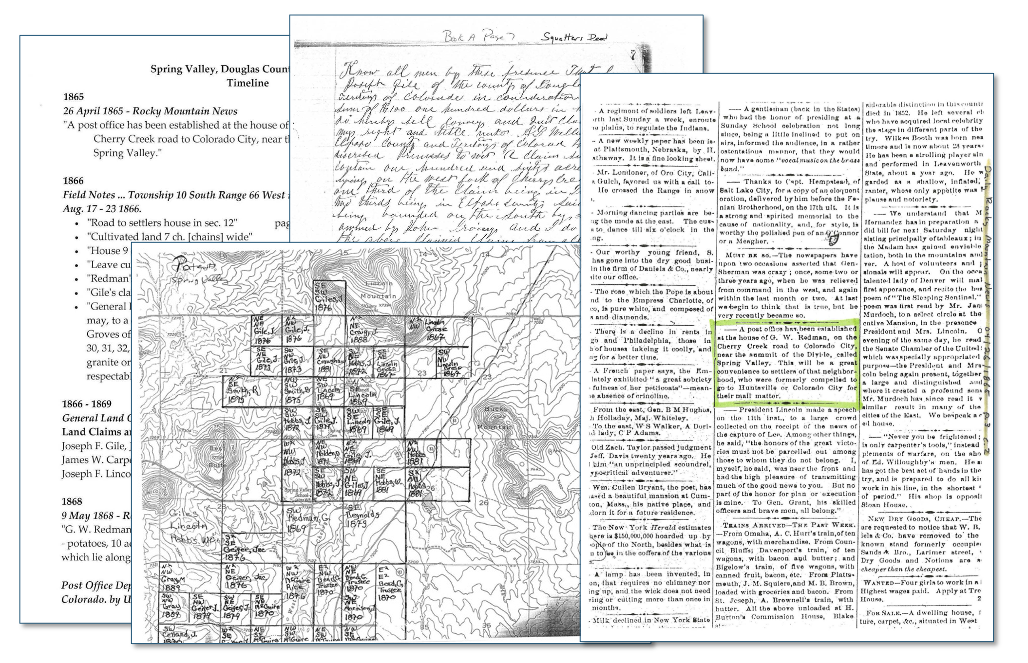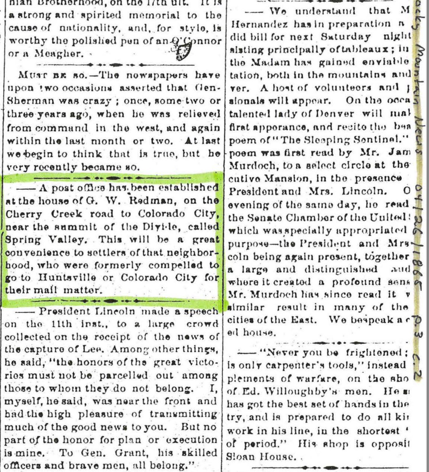 Many historic documents were burned when the Douglas County Courthouse was lost to fire in 1978, making these archives a valuable resource. The inclusion in an 1865 edition of the Rocky Mountain News announcing the Spring Valley Post Office and summarizing President Lincoln’s speech regarding the capture of Robert E. Lee offers a fascinating juxtaposition of local and national history.