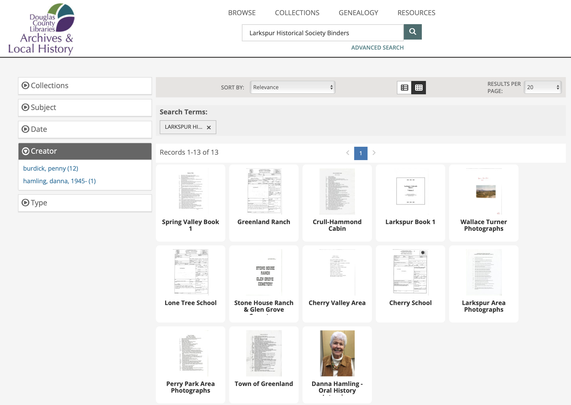As an example, searching for “Larkspur Historical Society Binders” will produce documents related to this project.