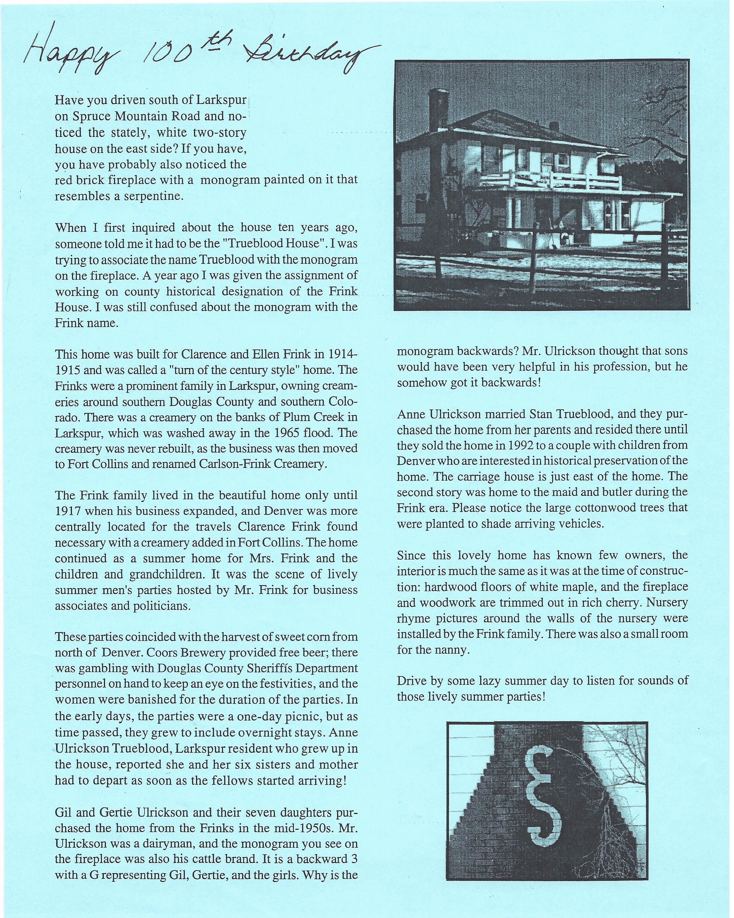Frink House Celebrates 100th Anniversary